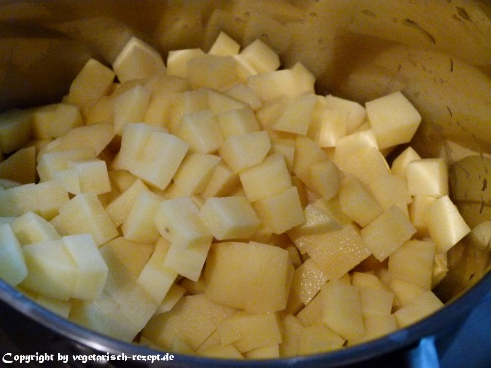 Als erstes die Kartoffeln schälen, grob würfeln und in wenig (leicht gesalzenem) Wasser weich kochen.