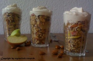 Anschließend die Hafer – Obst – Mandel – Mischung in Latte-Macchiato-Gläser füllen und dabei ungefähr 2 – 3 cm vom oberen Rand frei lassen.