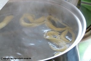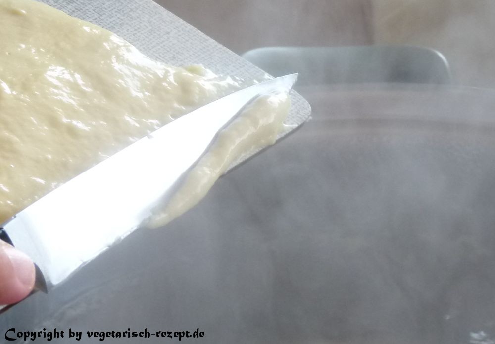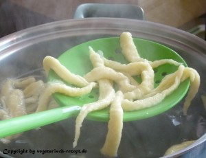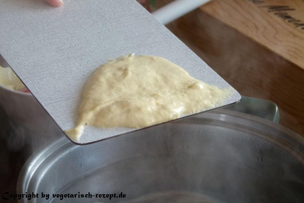 Die abgeschabten Teigstücke landen dann direkt im Wasser. Sie werden erst absinken und später wieder nach oben schwimmen. Sobald sie oben schwimmen, sind sie fertig.