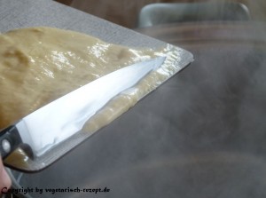 Das Messer nach jedem 2ten oder 3ten Spätzle erneut kurz ins kochende Wasser tauchen, damit sich der Teig leicht vom Messer löst und nicht kleben bleibt!