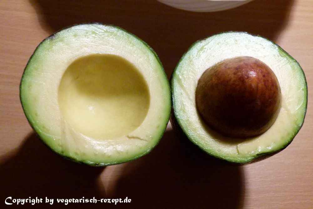 Als erstes wird die Avocado in der Mitte geteilt. Mit dem Messer also bis zum Kern einschneiden und dann um den Kern herum schneiden.