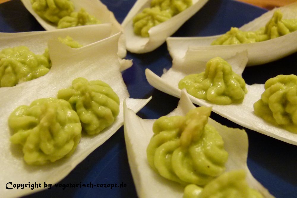Ich habe die Guacamole in einen Spritzbeutel gegeben und sie auf Chicoree-Schiffchen gespritzt.