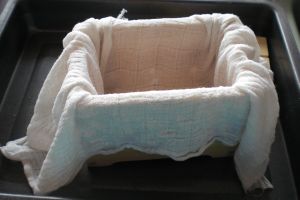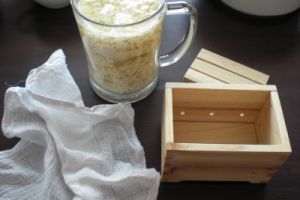 Mein Mann hat mir eine Tofupresse gebastelt und ich nehme ein Baumwolltüchli zum sieben..