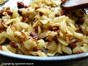 In der Zwischenzeit Zwiebeln schälen, in Würfel schneiden und mit den klein geschnittenen Tomaten langsam in Öl anbraten.