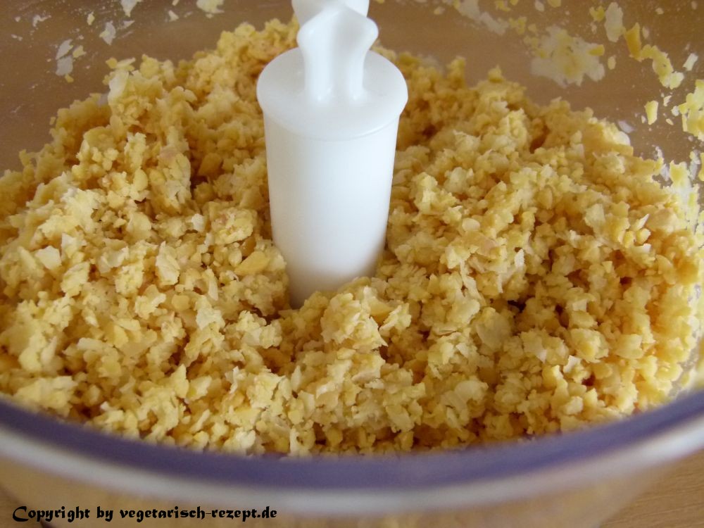 Dann die Kichererbsen durch ein Sieb abgießen, abspülen und kurz abtropfen lassen. Nun ab damit in die Küchenmaschine, Senf und Zitronensaft dazu geben und die Kichererbsen hächseln: