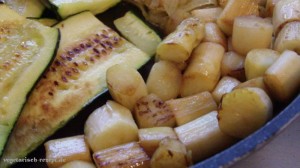 Jetzt fehlt nur noch der Spargel … Spargel schälen in 1 – 2cm große Stücke schneiden und zum restlichen Gemüse in die Pfanne geben. Alles schön anbraten.