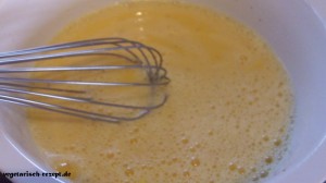 Während es in der Pfanne so vor sich hin brutzelt, werden die Eier aufgeschlagen und mit Salz, Pfeffer und Muskat würzen und kräftig mit dem Schneebesen verrühren. Da das Gemüse nicht gewürzt ist, sollten die Eier etwas stärker gewürzt sein, damit es nachher nicht so fade schmeckt …