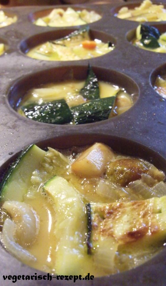 Fast schon fertig. Denn jetzt werden nur noch die einzelnen Muffinformen mit jeweils 2 – 3 EL Ei gefüllt und das Gemüse nach Belieben drin verteilt.