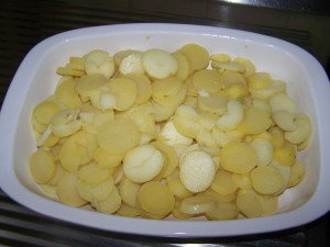 Die Kartoffeln abgießen, abschrecken und pellen. Eine Auflaufform bereit stellen. Die Kartoffeln in Scheiben schneiden und beliebig in der Form schichten.