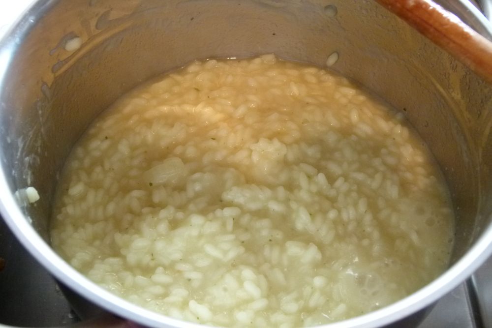 Bis der Risotto Reis gar ist, dauert es ca. 20-25 Minuten. … und immer rühren — rühren — rühren … (da kriegt man echt Muskeln von ;-))