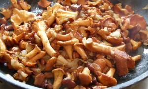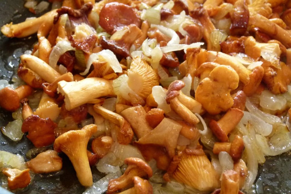 1 Zwiebel schälen, würfeln und in der Pfanne, in Öl andünsten. Pfifferlinge putzen und zu den Zwiebeln in die Pfanne geben. Wenn es große Pfifferlinge sind, kannst Du sie auch etwas klein schneiden. Aber nicht zu klein, damit sie nicht in der Pfanne anbrennen.