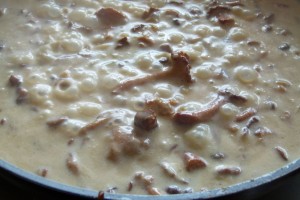 Ungefähr die Hälfte davon mit einem Messer etwas klein hacken und in einer anderen Pfanne/Topf warm halten. Den Rest des Zwiebel-Pfifferling-Gemischs mit der Hälfte der Milch ablöschen.