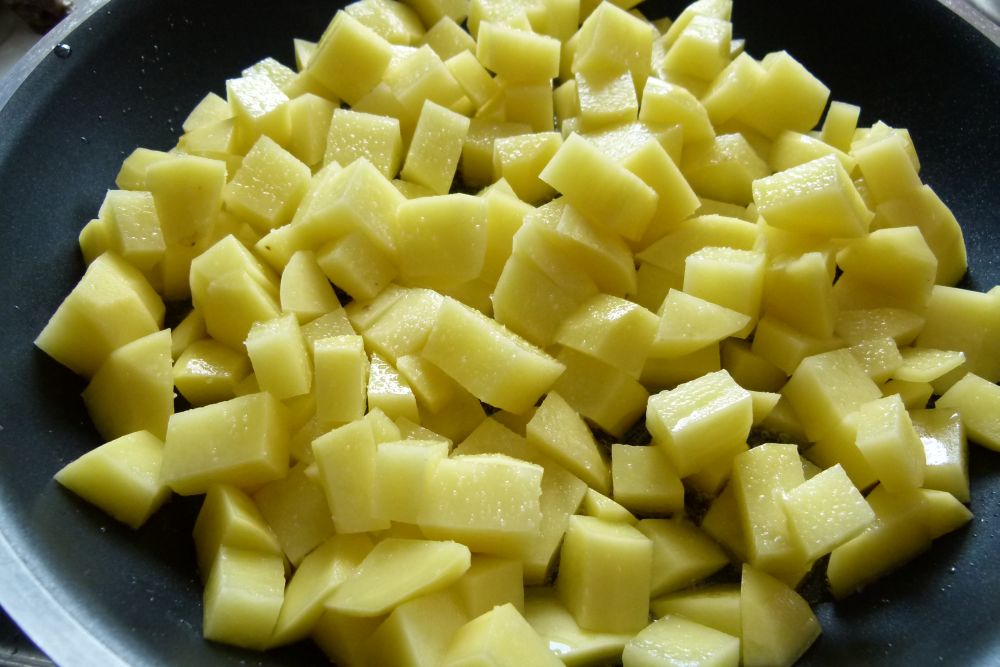 Die Kartoffeln schälen, in kleine Würfel schneiden, salzen und in einer Pfanne mit Öl anbraten. Auf kleiner Stufe, da sonst die Kartoffeln außen schwarz und innen roh sind.