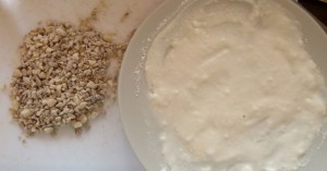 (Ich habe diese Mehl-Creme absichtlich etwas dicker gemacht, damit Sonnenblumenkerne und Erdnüsse auch wirklich dran haften bleiben )