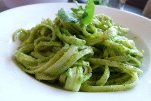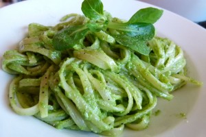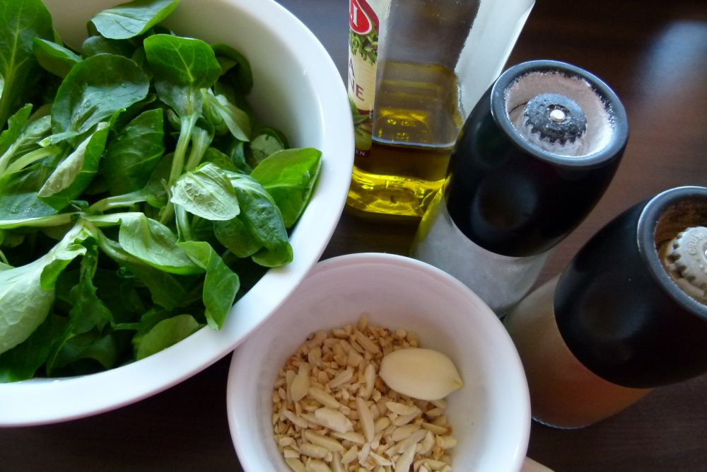 Statt mit Basilikum, wie man Pesto sonst so kennt, gibt’s hier ein Feldsalat – Pesto Rezept.