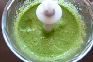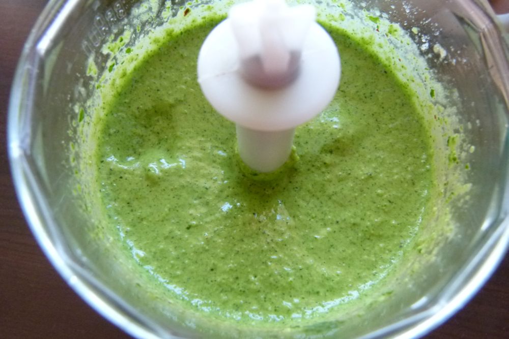 Jetzt das restliche Öl (von den 90ml) nach und nach dazu geben, bis das Pesto eine schön cremige Konsistenz bekommt.