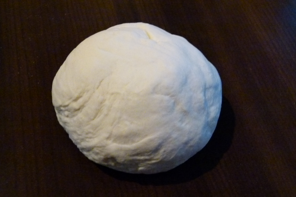 Dafür Mehl, Wasser und Salz zu einem Teig verarbeiten, der nicht mehr klebt.
