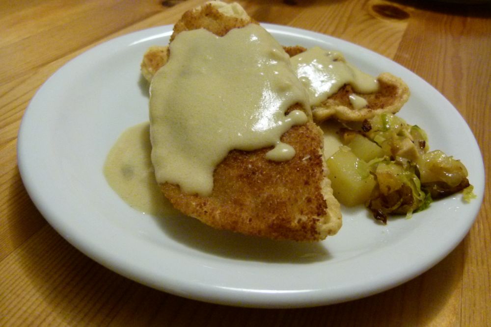 Ich habe sie noch mit einem Mehl-Wasser-Gemisch bestrichen, in Paniermehl gewälzt und anschließend in der Pfanne gebraten.