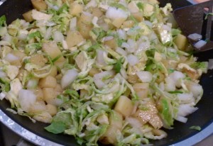 Die Rosenkohlköpfchen putzen, halbieren und in dünne streifen schneiden und ebenfalls ab damit in die Pfanne.