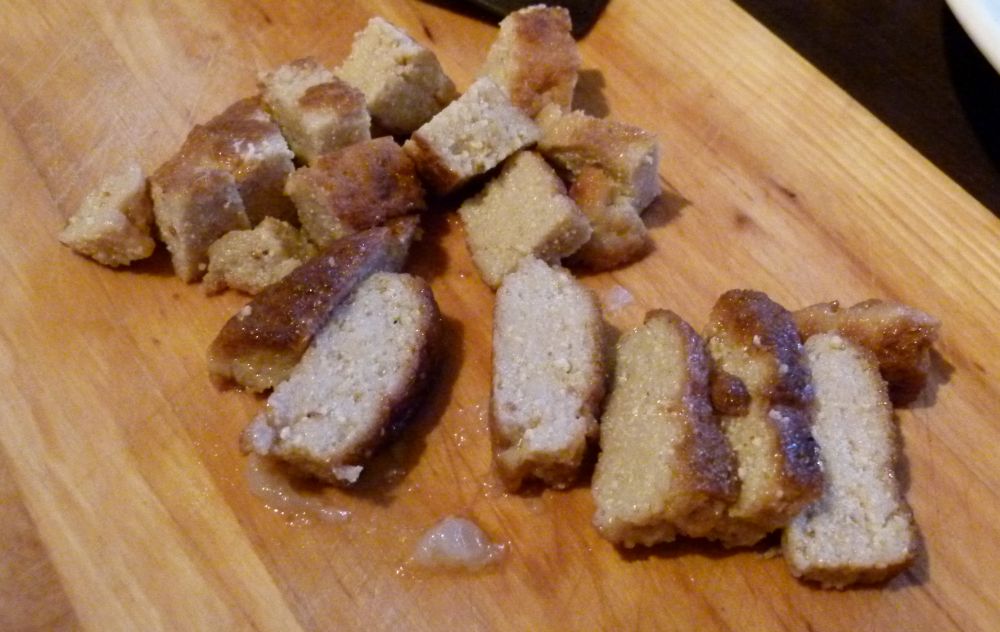 Jetzt noch die Seitanschnitzel in Scheiben oder Würfel schneiden