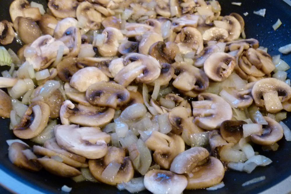 Champignons putzen, in dicke Scheiben schneiden und mit den Zwiebeln in die heiße Pfanne (mit Öl) geben.