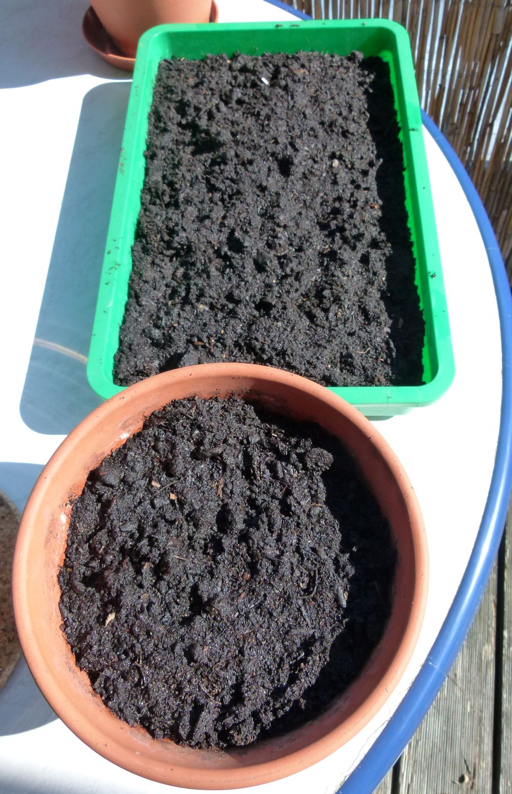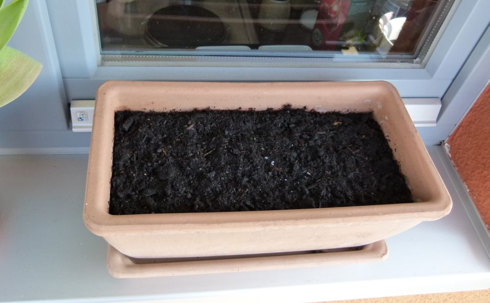 Hier im Kasten keimen hoffentlich bald Petersilie, Rosmarin, Basilikum und Schnittlauch