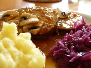 … und servieren (Ich hab aus dem Kochsud kurzerhand eine dunkle Soße gezaubert und dazu Kartoffeln gekocht und gestampft und etwas Rotkohl dazu)