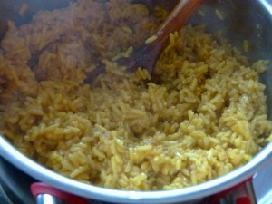 Dann gebe ich den trockenen Reis dazu und rühre alles kräftig durch, bis die Gewürze sich komplett mit den Reiskörnern vermischt haben.