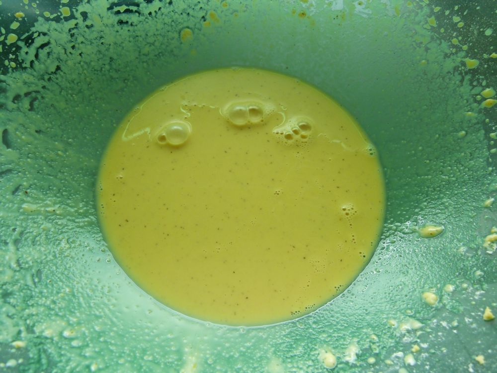 Sojamehl und Wasser mit dem Handrührer gut verrühren. Zitronensaft, Vanillezucker und Puddingpulver (ganz einfaches reicht völlig aus … ich hatte nur kein anderes mehr da) dazu geben und zu einer glatten Masse mixen.
