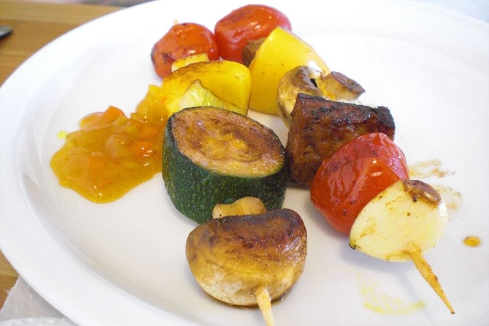Mit Salat und Barbecue-Sauce servieren …. Diese Weizenfleisch-Spieße sind eine leckere Grillvariante, die nicht nur vegetarisch sondern auch Low Carb (und vegan) ist.