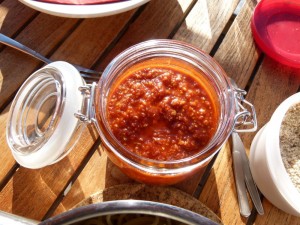 Diese Zutaten hat man meistens sowieso zu Hause und kann dann auch mal spontan das rote Pesto machen.