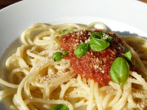 Nun das Ganze einfach auf Pasta geben und den selbstgemachten Streukäse drüber … und mmmmmmmmh