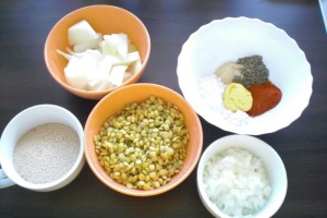 Nun den Brei in eine größere Schüssel geben und mit den fein geschnittenen Zwiebeln und dem Paniermehl vermischen. Erst mit der Gabel, dann mit den Händen alles gut verkneten.